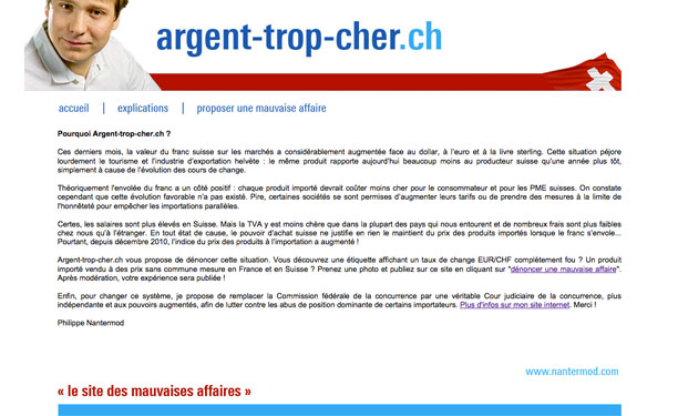 C’est certain, la force du franc fort pèse sur la vitalité de l’économie helvétique. Les Suissesses et les Suisses s’attendent à des diminutions de salaire et à des suppressions de poste de travail. Revers de la médaille, le prix des produits importés devrait a contrario diminuer, ce qui n’est pas le cas. Depuis décembre 2010, l’indice des prix importés a même augmenté de 0.5 point. Face à cette situation, le candidat PLR Philippe Nantermod lance une action sur internet : le site www.argent-trop-cher.ch !