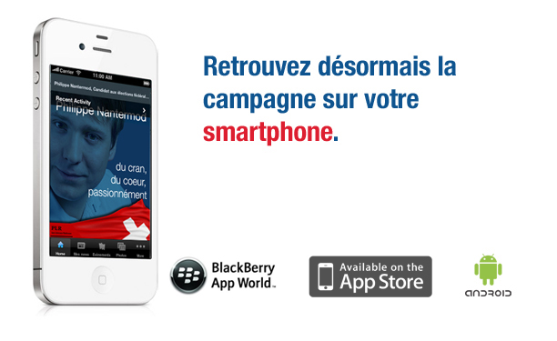 Aujourd’hui sort la première application Smartphone d’un candidat au Conseil national. Philippe Nantermod est déjà très actif sur Internet depuis des années et confirme sa volonté de dialoguer avec les citoyens valaisans en innovant, au moyen d’un logiciel compatible avec les téléphones iPhone, Android et Blackberry. Photos, vidéos, commentaires agenda, tout y est !